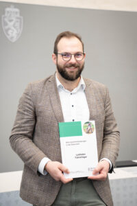 Umweltanwalt Maximilian Lughofer flankiert von Eva Baumgartner (l.) und Klaudia Sonnleitner, die maßgeblich an der Produktion des "Leitfadens Fahrerlager" beteiligt waren. Gruppenbild von der Präsentation Bild: © Land Steiermark/ Resch